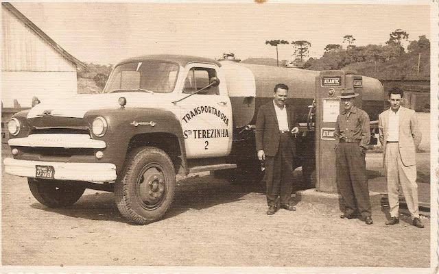 Caminhão Chevrolet Brasil 1958/1962, carroceria tanque ao lado da bomba de gasolina atlantic.